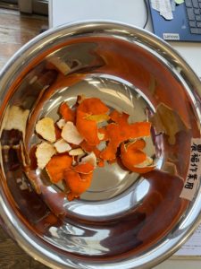 中平さん「入浴中に「みかんの皮を昔お風呂に入れてました」と伺い、実際にご本人作って頂き明日入れて試してみようと思います♨️」